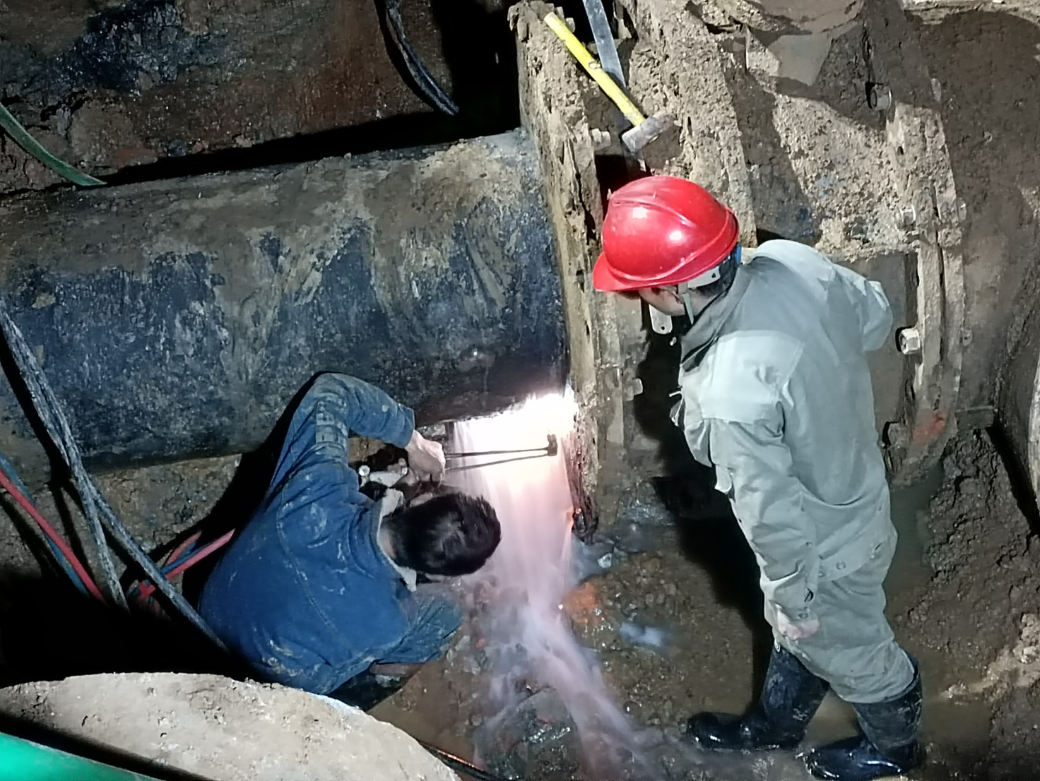 晚上10點(diǎn),更換工作正式開始,關(guān)閘止水、排空積水、拆除舊蝶閥、安裝新蝶閥,流程看似簡單,但每道工序都有嚴(yán)格的操作規(guī)程,需要現(xiàn)場每個(gè)人的付出和配合。時(shí)值倒春寒天氣,現(xiàn)場寒風(fēng)陣陣,工作坑內(nèi)更是寒氣逼人,但維修人員全然不顧,搶時(shí)間,爭速度,分工協(xié)作,輪流上陣,連續(xù)作戰(zhàn)。