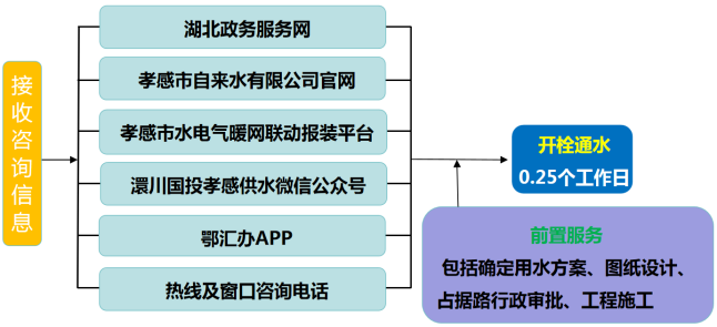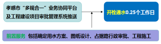 流程說明:供水企業(yè)通過孝感市“多規(guī)合一”業(yè)務(wù)協(xié)同平臺及工程建設(shè)項目審批管理系統(tǒng)推送獲取項目建設(shè)信息后主動對接,先行開展確定用水方案、圖紙設(shè)計、工程施工等服務(wù),辦理用水工程涉及的占道、掘路、占用綠地、伐移樹木等相關(guān)行政審批手續(xù),提前完成外線工程實施,為客戶提供“無感免申請”服務(wù)??蛻粜枰盟畷r,0.25個工作日內(nèi)開栓通水。