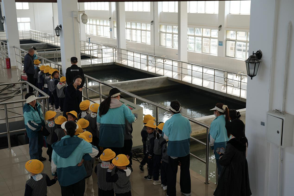 為貼合幼兒認知特點,公司精心安排了4名專業(yè)講解員、10名引導員及6名安全員,全程保障活動安全有序開展。在講解員生動通俗的引導下,孩子們分組依次參觀了反應池、沉淀池、濾池、清水池、送水泵房及調(diào)度室等核心生產(chǎn)區(qū)域,親眼見證了“渾濁原水”變身“潔凈自來水”的奇妙過程。在反應池和沉淀池,講解員用“魔法藥劑”的生動比喻,向孩子們講解混凝劑的作用,引導大家觀察水中雜質(zhì)凝結(jié)成絮狀物并沉淀的過程;在濾池,工作人員現(xiàn)場演示過濾原理,讓孩子們直觀感受水的凈化效果;在清水池,孩子們了解到潔凈水的儲存與調(diào)配方式;在送水泵房和調(diào)度室,自動化供水設備、城市供水管網(wǎng)實時運行畫面,讓孩子們真切感受到城市供水系統(tǒng)的智慧與高效,讀懂了每一滴水從水廠到家中水龍頭的完整旅程。